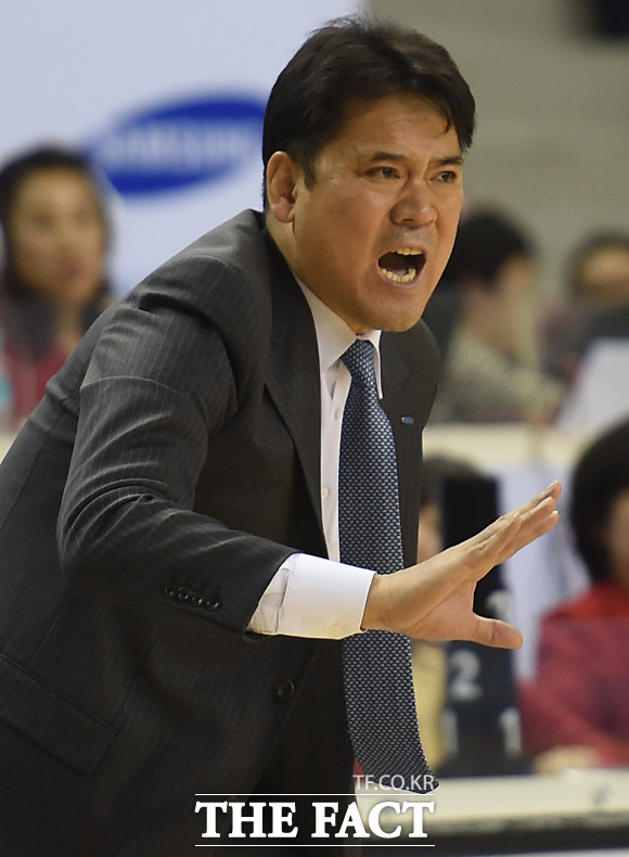 [더팩트|용인체육관=최용민 기자]23일 오후 경기도 용인체육관에서 열린 'KB국민은행 2014-2015 여자프로농구' 삼성생과 KDB생명의 경기에서 삼성 이호근 감독이 4쿼터 후반 스코어 63-64으로 팀이 KDB의 턱밑까지 점수를 추격하자 선수들을 독려하고 있다.