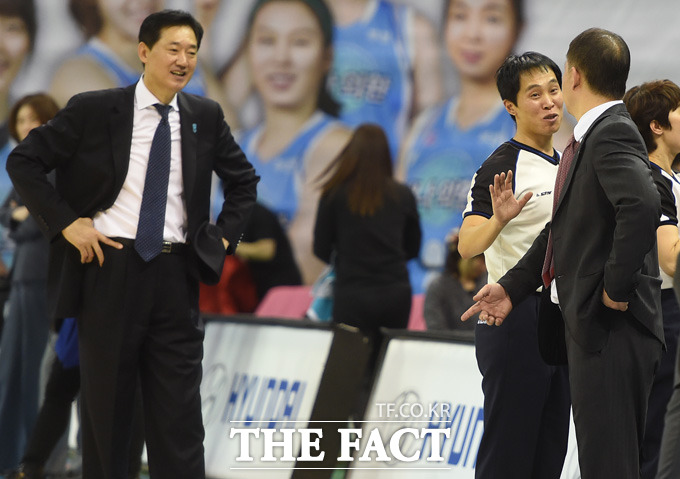 30일 오후 경기도 부천체육관에서 열린 'KB국민은행 2014-2015 여자프로농구' 하나외환과 신한은행의 경기에서 63-59로 신한은행이 승리를 거둔 가운데 양팀 감독이 심판판정에 불만을 품고 항의를 하고 있다.