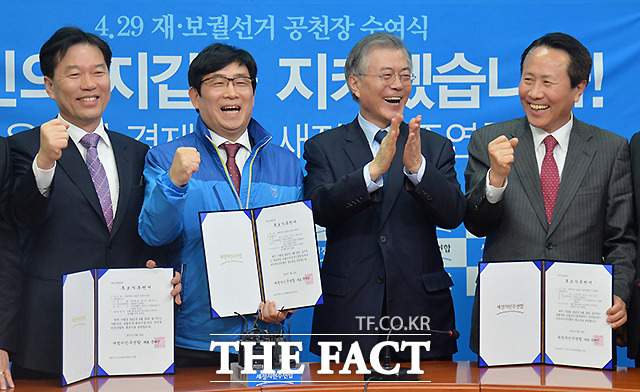 19일 오전 서울 여의도 국회에서 열린 새정치민주연합 4.29 재·보궐선거 공천장 수여식에서 정태호(서울 관악 을), 정환석(경기 성남 중원) 후보, 문재인 대표, 조영택(광주 서구 을) 후보자(왼쪽부터)가 파이팅을 외치고 밝게 웃고 있다.