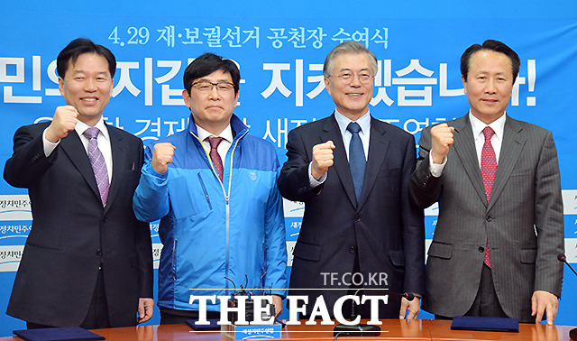 19일 오전 서울 여의도 국회에서 열린 새정치민주연합 4.29 재·보궐선거 공천장 수여식에서 정태호(서울 관악 을), 정환석(경기 성남 중원) 후보, 문재인 대표, 조영택(광주 서구 을) 후보자(왼쪽부터)가 파이팅을 외치고 있다.