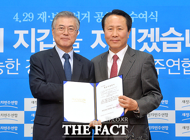 새정치민주연합 문재인 대표(왼쪽)가 19일 오전 서울 여의도 국회에서 열린 4.29 재·보궐선거 공천장 수여식에서 조영택(광주 서구 을) 후보자와 함께 포토타임을 갖고 있다.