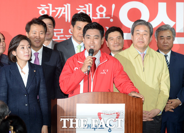 4.29 재보궐 선거 관악을에 출마한 오신환 새누리당 후보가 8일 오후 서울 관악구 선거사무소에서 열린 개소식 및 출정식에서 인사말을 하고 있다.