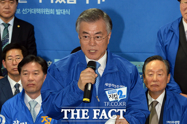 문재인 새정치민주연합 대표(가운데)가 10일 오후 4.29 재보궐 선거 관악을에 출마한 정태호 후보 선거 사무소에서 열린 선거대책위 출범식에 참석해 인사말을 하고 있다.