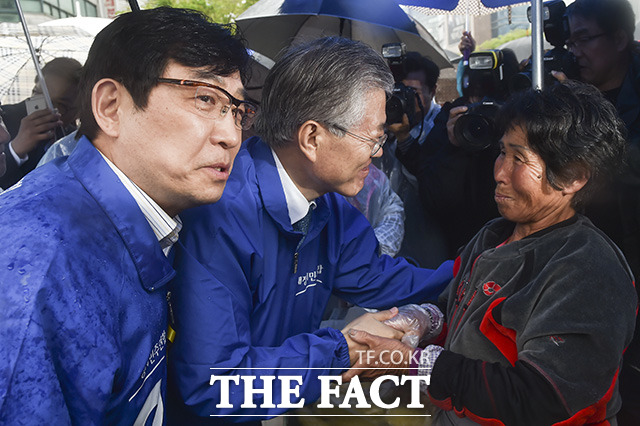 문재인 새정치민주연합 대표(가운데)가 19일 오후 경기도 성남시 중원구 모란시장 입구에서 열린 정환석 후보 4.29 재보선 출정식에 참석해 정환석 후보(왼쪽)와 함께 유권자에게 지지를 호소하고 있다.