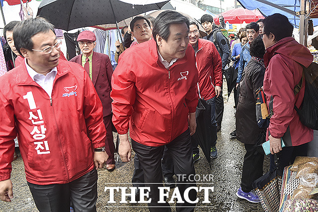 김무성 새누리당 대표(가운데)가 19일 오후 경기도 성남시 중원구 모란시장에서 열린 신상진 후보 4.29 재보선 유세에 참석해 상인들에게 지지를 호소하며 미소를 짓고 있다.
