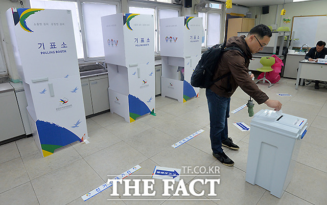 4.29 국회의원 재보궐 선거일인 29일 오전 경기 성남시 중원구 중앙초등학교에 마련된 투표소에서 유권자들이 소중한 한 표를 행사하고 있다.