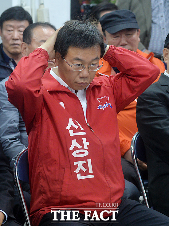4.29 재보궐 선거일인 29일 오후 경기 성남 중원에 출마한 새누리당 신상진 후보가 유권자들의 투표가 끝난 뒤 성남 중원구 선거사무소를 찾아 개표방송을 보고 있다.