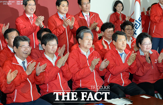 김무성 새누리당 대표와 유승민 원내대표를 비롯한 당지도부가 4.29 재보궐 선거 투표가 끝난 29일 저녁 서울 여의도 새누리당 당사에서 개표 결과를 지켜보며 승리의 박수를 치고 있다.