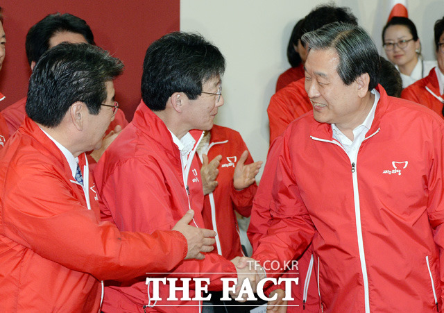 김무성 새누리당 대표(오른쪽)가 4.29 재보궐 선거 투표가 끝난 29일 저녁 서울 여의도 새누리당 당사에 도착해 유승민 원내대표와 악수를 나누고 있다.