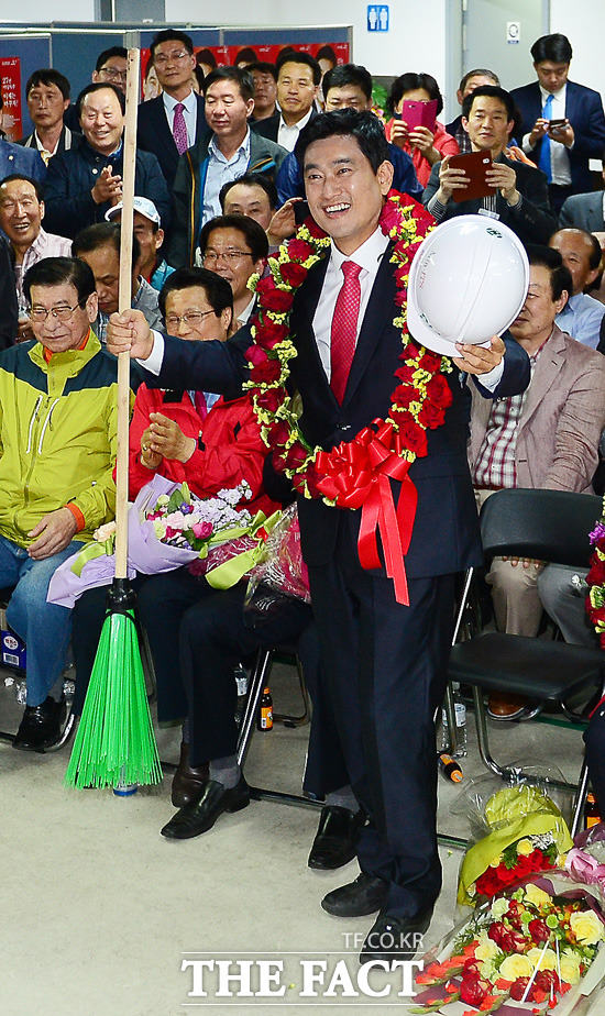 4.29 재보궐 선거에서 서울 관악을 국회의원으로 당선된 새누리당 오신환 당선자가 29일 오후 관악구 선거사무소에서 환호를 지르고 있다.