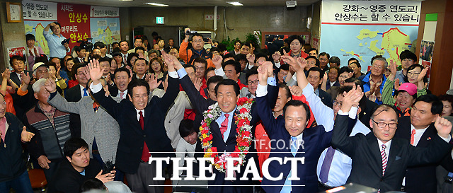 4.29 국회의원 재보궐 선거일인 29일 오후 당선이 확실시 된 인천서구 강화을 새누리당 안상수 후보가 인천 강화군 강화읍 신문리 선거사무소를 찾아 지지자들과 함께 당선 기념 세리머니를 하고 있다. 이날 재보궐 선거는 서울 관악구을, 인천 서구강화군을, 광주 서구을, 경기 성남시 중원구 4곳에서 실시됐다.