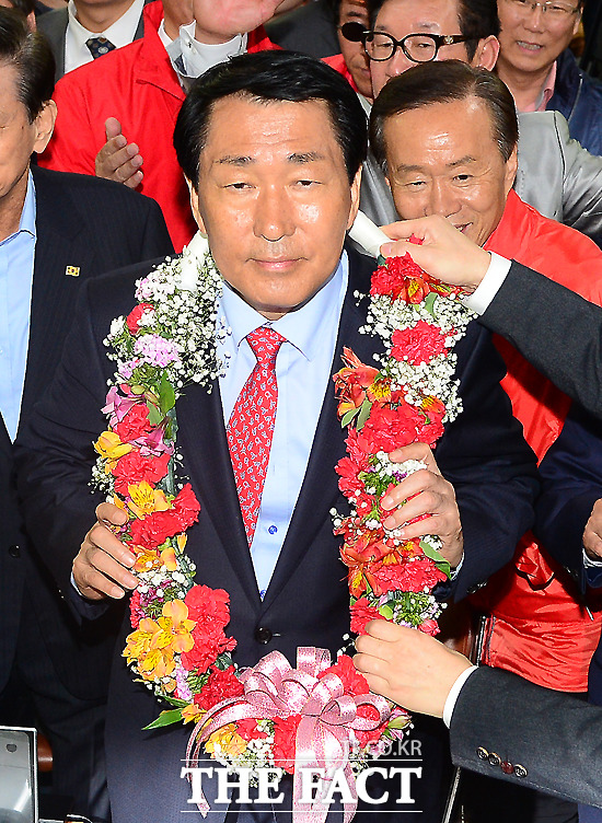 4.29 국회의원 재보궐 선거일인 29일 오후 당선이 확실시 된 인천서구 강화을 새누리당 안상수 후보가 인천 강화군 강화읍 신문리 선거사무소에서 지지자들로부터 꽃목걸이를 받고 있다. 이날 재보궐 선거는 서울 관악구을, 인천 서구강화군을, 광주 서구을, 경기 성남시 중원구 4곳에서 실시됐다.