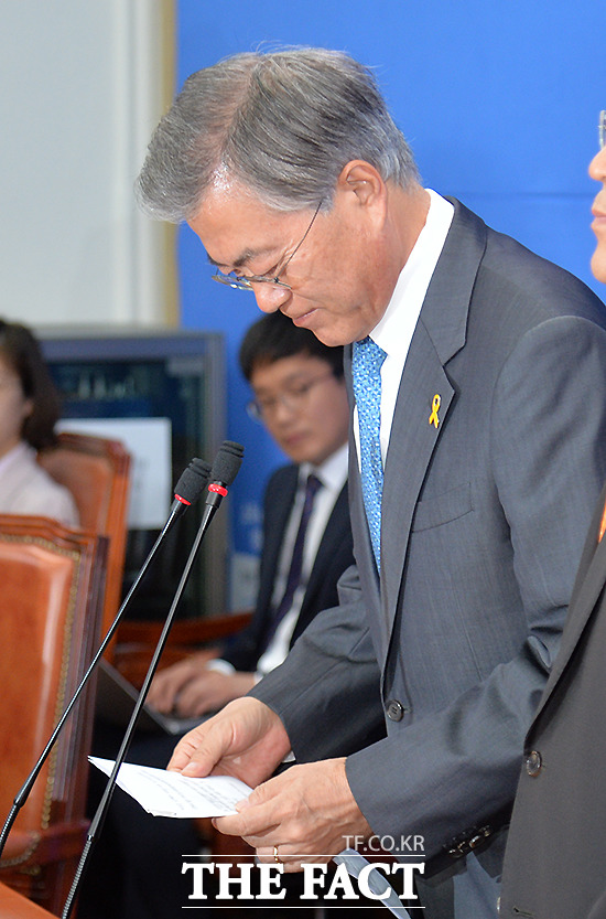 새정치민주연합 문재인 대표가 30일 오전 서울 여의도 국회에서 열린 정책조정회의에 앞서 4.29 재보궐 선거 참패에 대한 입장을 밝히며 고개를 숙이고 있다.
