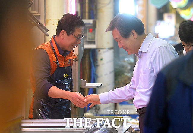 새누리당 김무성 대표가 4·29 재보궐 선거 감사 인사를 위해 19일 오후 서울 관악구 신원시장을 찾아 상인들에게 인사를 하고 있다.