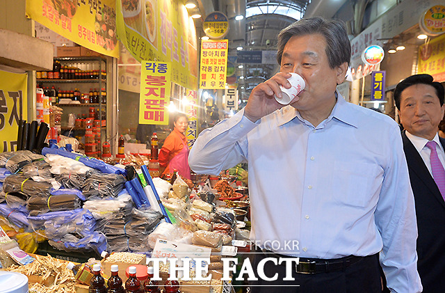 새누리당 김무성 대표가 4·29 재보궐 선거 감사 인사를 위해 19일 오후 서울 관악구 신원시장을 찾은 가운데 상인들이 건네준 음료수를 마시고 있다.