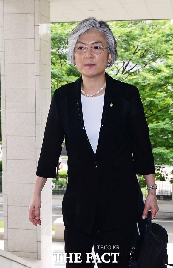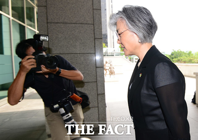 [더팩트ㅣ배정한 기자] 강경화 신임 외교부 장관이 19일 오전 서울 종로구 외교부청사로 출근을 하고 있다.