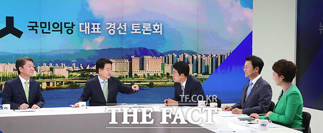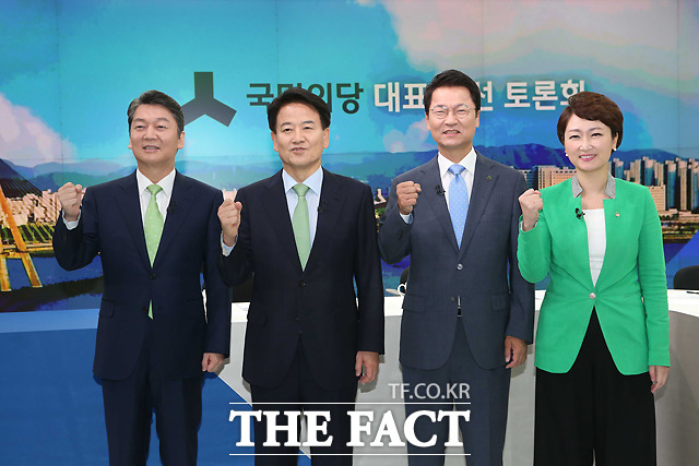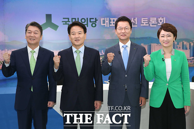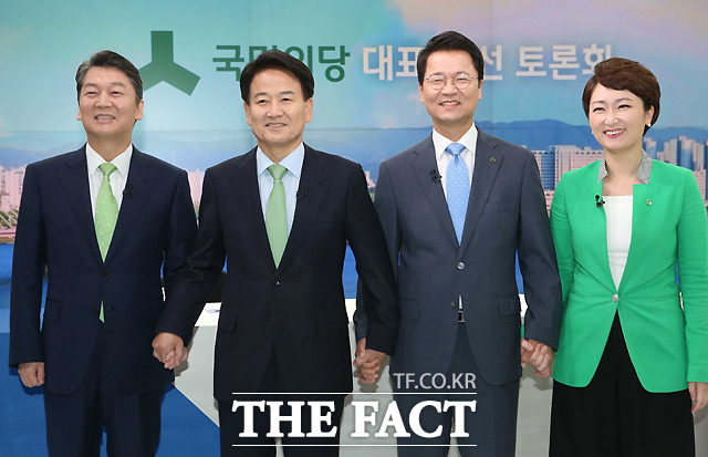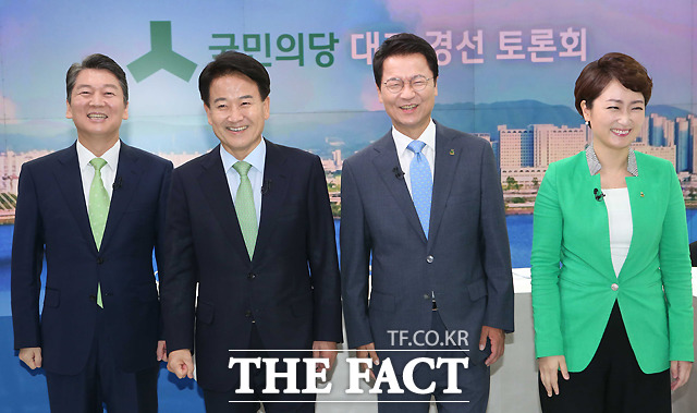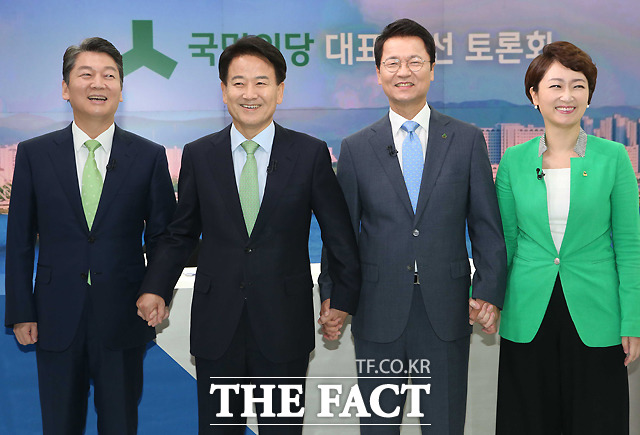 [더팩트ㅣ국회사진취재단] 8.27 국민의당 전당대회에 당대표로 출마한 안철수 후보와 정동영 후보, 천정배 후보, 이언주 후보(왼쪽부터)가 14일 서울 상암동 JTBC사옥에서 첫 TV토론회에 앞서 포즈를 취하고 있다.
