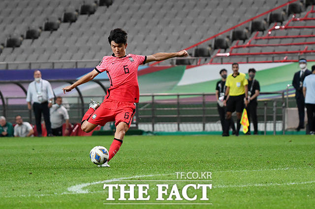 [더팩트ㅣ상암월드컵경기장=남용희 기자] 2일 오후 서울 마포구 서울상암월드컵경기장에서 '2022 카타르 월드컵 최종예선 1차전' 대한민국과 이라크의 경기가 열린 가운데 황인범이 슈팅을 시도하고 있다.