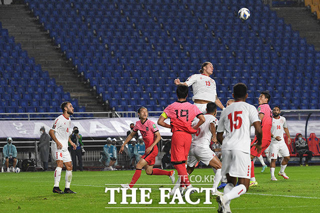 [더팩트ㅣ수원월드컵경기장=남용희 기자] 7일 오후 경기도 수원시 팔달구 수원월드컵경기장에서 '2022 카타르 월드컵 최종예선 2차전' 대한민국과 레바논의 경기가 열린 가운데 선수들이 공중볼 다툼을 하고 있다.