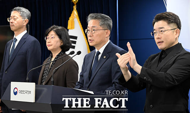 [더팩트ㅣ임영무 기자] 김민석 고용노동부 차관(가운데)이 11일 오후 서울 종로구 정부서울청사 브리핑룸에서 고용노동정책 성과 및 향후 추진계획과 관련해 브리핑 하고 있다.