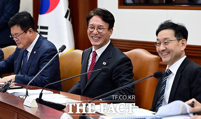 [더팩트ㅣ임영무 기자] 김민석 국무총리(가운데)가 24일 오후 서울 종로구 정부서울청사에서 열린 국정현안관계장관회의에 참석해 인사를 나누며 미소 짓고 있다.