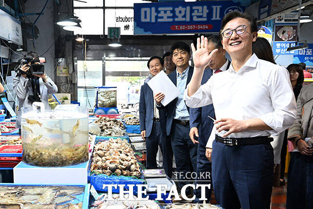 [더팩트ㅣ남용희 기자] 전재수 해양수산부 장관이 1일 오후 서울 마포농수산물시장을 방문해 상인들에게 인사를 하고 있다.
