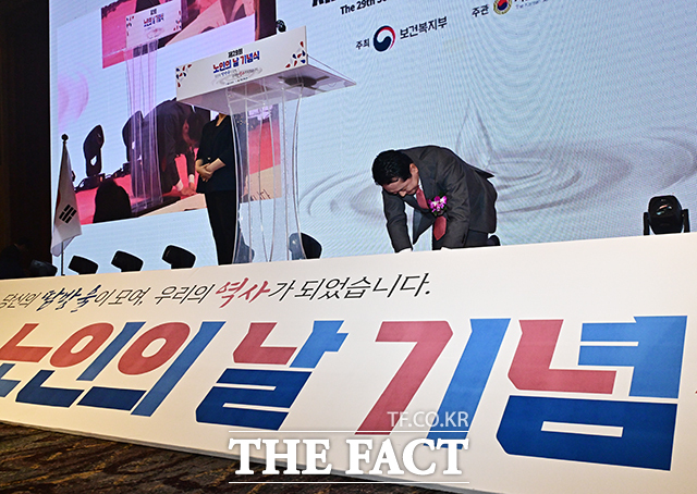 [더팩트ㅣ배정한 기자] 장동혁 국민의힘 대표가 2일 오전 서울 소공동 롯데호텔에서 열린 제29회 노인의 날 기념식에 참석해 축사에 앞서 큰절을 하고 있다.