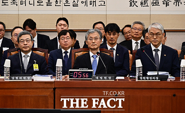 [더팩트ㅣ국회=배정한 기자] 조희대 대법원장(가운데)이 13일 오전 서울 여의도 국회 법제사법위원회에서 열린 대법원에 대한 국정감사에 참석하고 있다.