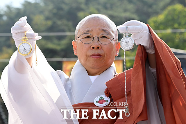 [더팩트ㅣ남용희 기자] 진관사 주지 법해 스님이 25일 오전 서울 은평구 진관사에서 열린 국행수륙재에서 김진 광복회 부회장이 전달한 김구 선생과 윤봉길 의사가 교환했던 회중시계를 본 뜬 기념품을 들어보이고 있다.