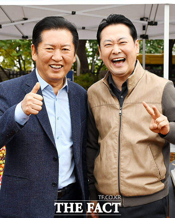 [더팩트ㅣ사진공동취재단] 정청래(왼쪽) 더불어민주당 대표와 장동혁 국민의힘 대표가 8일 서울 여의도 국회운동장에서 한국사진기자협회 주최로 열린 '2025 사진기자가족 체육대회'를 방문해 사진기자들의 요청에 포즈를 취하며 웃음을 짓고 있다.