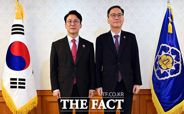 [더팩트ㅣ임영무 기자] 김민석 국무총리가 25일 오후 서울 종로구 정부서울청사에서 열린 차관급 임명장 수여식에서 김영수 문화체육관광부 1차관에게 임명장을 수여한 뒤 기념촬영을 하고 있다.