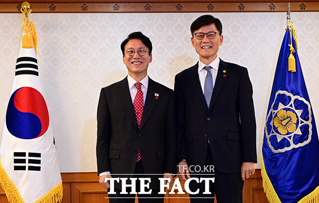[더팩트ㅣ임영무 기자] 김민석 국무총리(왼쪽)가 25일 오후 서울 종로구 정부서울청사에서 열린 차관급 임명장 수여식에서 정상우 감사원 사무총장에게 임명장을 수여한 뒤 기념촬영을 하고 있다.