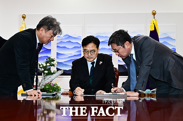 [더팩트 | 국회=배정한 기자] 우원식 국회의장(가운데)이 27일 오전 서울 여의도 국회에서 열린 여야 원내대표 회동에 앞서 본회의 안건을 확인하고 있다.