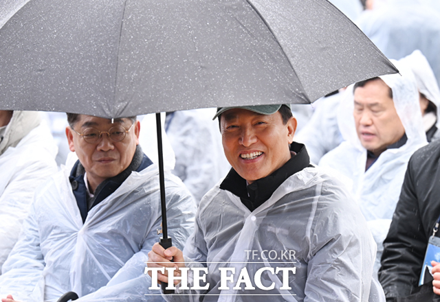 [더팩트ㅣ이새롬 기자] 오세훈 서울시장이 27일 오후 서울 용산구 정비창 내 야외 행사장에서 열린 용산국제업무지구 도시개발사업 기공식에 참석해 우산을 쓴 채 웃음짓고 있다.