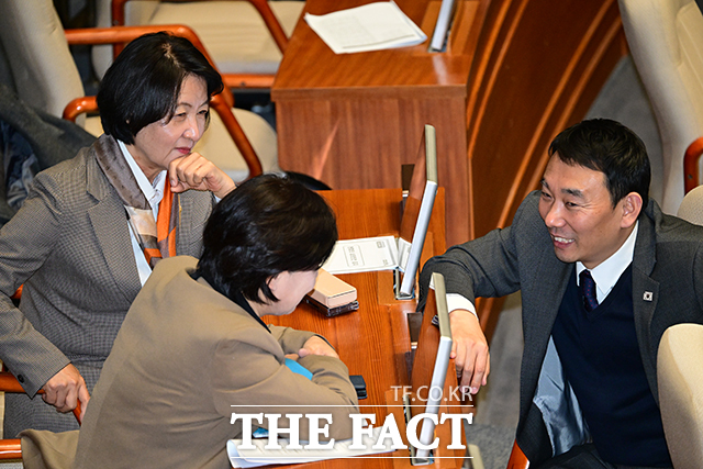 [더팩트ㅣ국회=남윤호 기자] 국회 법제사법위원회 소속 추미애 더불어민주당 의원(왼쪽)과 김용민, 서영교 의원이 27일 오후 서울 여의도 국회 본회의장에서 대화를 하고 있다.