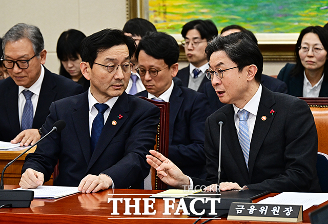 [더팩트 | 국회=배정한 기자] 윤창렬 국무조정실장(왼쪽)과 이억원 금융위원장이 3일 오후 서울 여의도 국회 정무위원회에서 열린 쿠팡 개인정보 유출 관련 현안질의에 출석해 대화를 하고 있다.