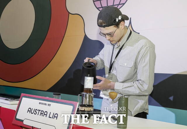 [더팩트ㅣ이효균 기자] ] 6일 서울 성수동 레이어스튜디오 41에서 열린 ‘2025 월드 에어로프레스 챔피언십’ 우승자인 호주 대표 네모 팝(Nemo Pop) 선수가 에어로프레스로 커피를 추출하고 있다.