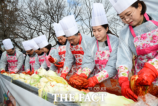 [더팩트ㅣ국회=남윤호 기자] 9일 오전 서울 여의도 국회 국회생생텃밭에서 열린 '김장 나눔 행사'에서 백선희 조국혁신당, 이주영 개혁신당, 김윤, 김영배, 남인순 더불어민주당 의원(오른쪽부터)이 김장 봉사를 하고 있다.