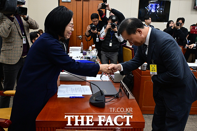 [더팩트ㅣ국회=남윤호 기자] 김종철 방송미디어통신위원회 위원장 후보(오른쪽)가 16일 오전 서울 여의도 국회 과학기술정보방송통신위원회에서 열린 인사청문회에 출석해 최민희 위원장과 악수하고 있다.
