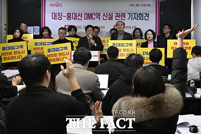 [더팩트 | 송호영 기자] 박강수 마포구청장이 17일 오후 서울 중구 상연재에서 열린 대장홍대선 DMC역 신설 관련 기자회견에서 취재진의 질문을 받고 있다.