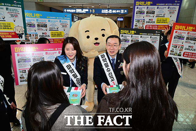 [더팩트ㅣ남윤호 기자] 이명구 관세청장(오른쪽)과 관세청 마약근절 홍보대사를 맡은 개그우먼 김승혜가 22일 오전 인천국제공항 제1여객터미널에서 '마약밀수 근절'을 위한 캠페인으로 공항 이용객에게 선물과 안내문을 전달하고 있다.