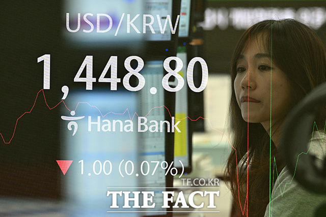 이날 서울 외환시장에서 달러화 대비 원화 환율은 0.1원 오른 1449.2원에 개장해 곧바로 1450원대에 올랐지만, 하락세로 전환해 1440원 후반대에서 거래되고 있다.