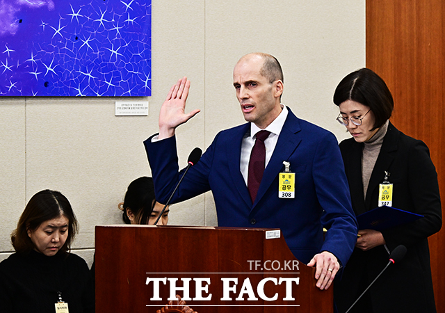 [더팩트 | 국회=배정한 기자] 해롤드 로저스 쿠팡 대표이사가 30일 오전 서울 여의도 국회에서 열린 ‘쿠팡 침해사고 및 개인정보 유출, 불공정 거래, 노동환경 실태 파악과 재발방지 대책 마련을 위한 청문회’에 증인으로 출석해 선서를 하고 있다.