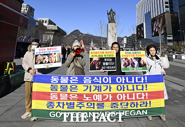 [더팩트ㅣ송호영 기자] 한국비건채식협회와 기후위기비건행동, 한국비건연대, 비건세상을위한시민모임, 한국채식연합 등 시민단체가 30일 오후 서울 종로구 광화문광장에서 '2026년 새해에는 비건(VEGAN) 채식하세요!' 기자회견을 열고 발언하고 있다.