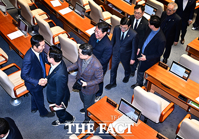[더팩트 | 국회=배정한 기자] 정청래 더불어민주당 대표(왼쪽)가 30일 오후 서울 여의도 국회에서 열린 제430회 국회(임시회) 제3차 본회의에 참석해 동료 의원들과 인사를 하고 있다.