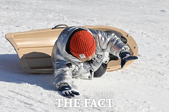 [더팩트 | 송호영 기자] 새해의 첫 월요일인 5일 오전 서울 영등포구 여의도 한강공원 눈썰매장에서 한 어린이가 눈썰매를 타던 중 미끌어지고 있다.