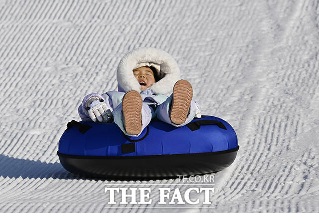 [더팩트 | 송호영 기자] 새해의 첫 월요일인 5일 오전 서울 영등포구 여의도 한강공원 눈썰매장에서 한 어린이가 눈썰매를 타고 있다.