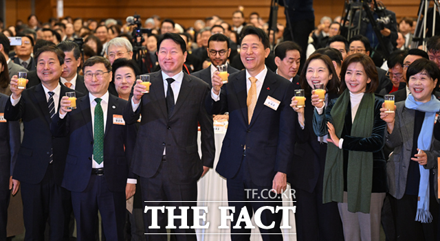 [더팩트ㅣ이새롬 기자] 오세훈 서울시장과 최태원 서울상공회의소 회장 등 참석자들이 7일 서울 중구 대한상공회의소에서 열린 2026 서울시 신년인사회에 참석해 건배를 하고 있다.