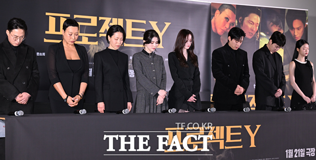 [더팩트ㅣ이새롬 기자] 8일 오후 서울 송파구 롯데시네마 월드타워점에서 열린 영화 '프로젝트Y' 언론시사회 및 기자간담회가 열린 가운데, 이환 감독과 출연 배우들이 간담회에 앞서 최근 고인이 된 배우 안성기를 추모하며 묵념하고 있다.