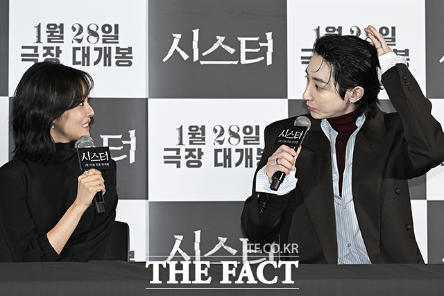 [더팩트 | 송호영 기자] 배우 차주영(왼쪽)과 이수혁이 12일 오후 서울 용산구 CGV 용산아이파크몰점에서 열린 영화 '시스터' 언론시사회 및 기자간담회에 참석해 대화를 나누고 있다.